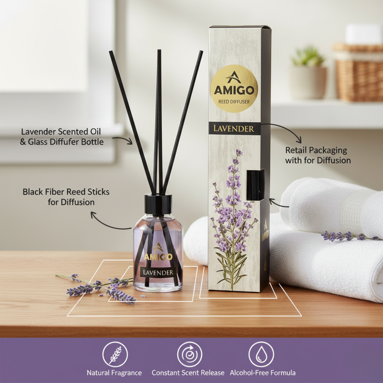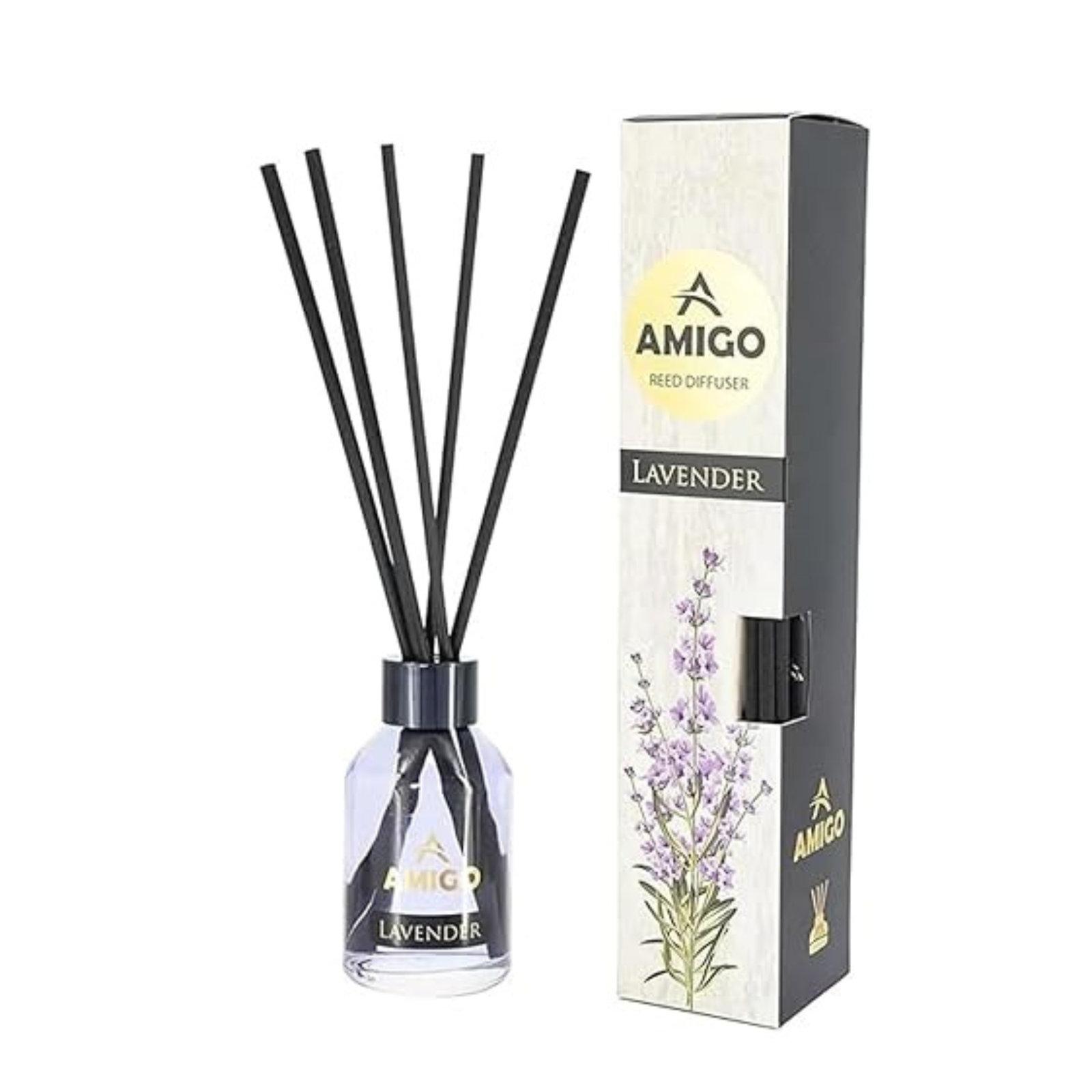 With floral-themed packaging and a minimalist bottle design, the Amigo Lavender Reed Diffuser complements a variety of interior styles and works well as a décor accessory or gifting option for everyday occasions.
