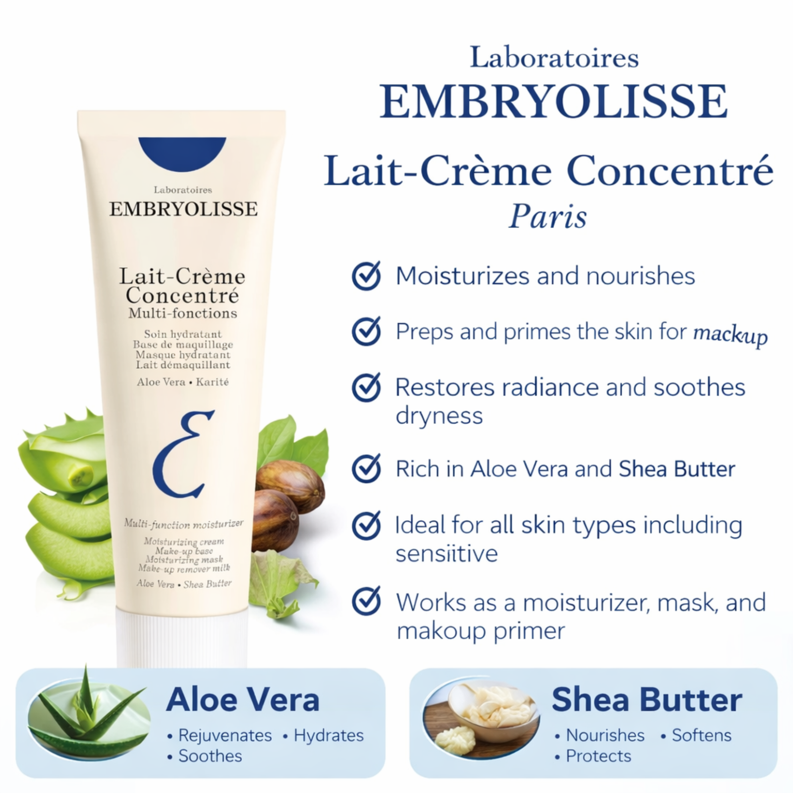 Embryolisse Lait-Crème Concentré is a multi-function face cream designed for daily hydration and skin preparation. Enriched with Aloe Vera and Shea Butter, this non-comedogenic formula helps maintain moisture, comfort, and smoothness across skin types. Commonly used as a moisturizer, makeup base, or hydrating mask, it supports a soft, balanced skin feel for everyday routines.
