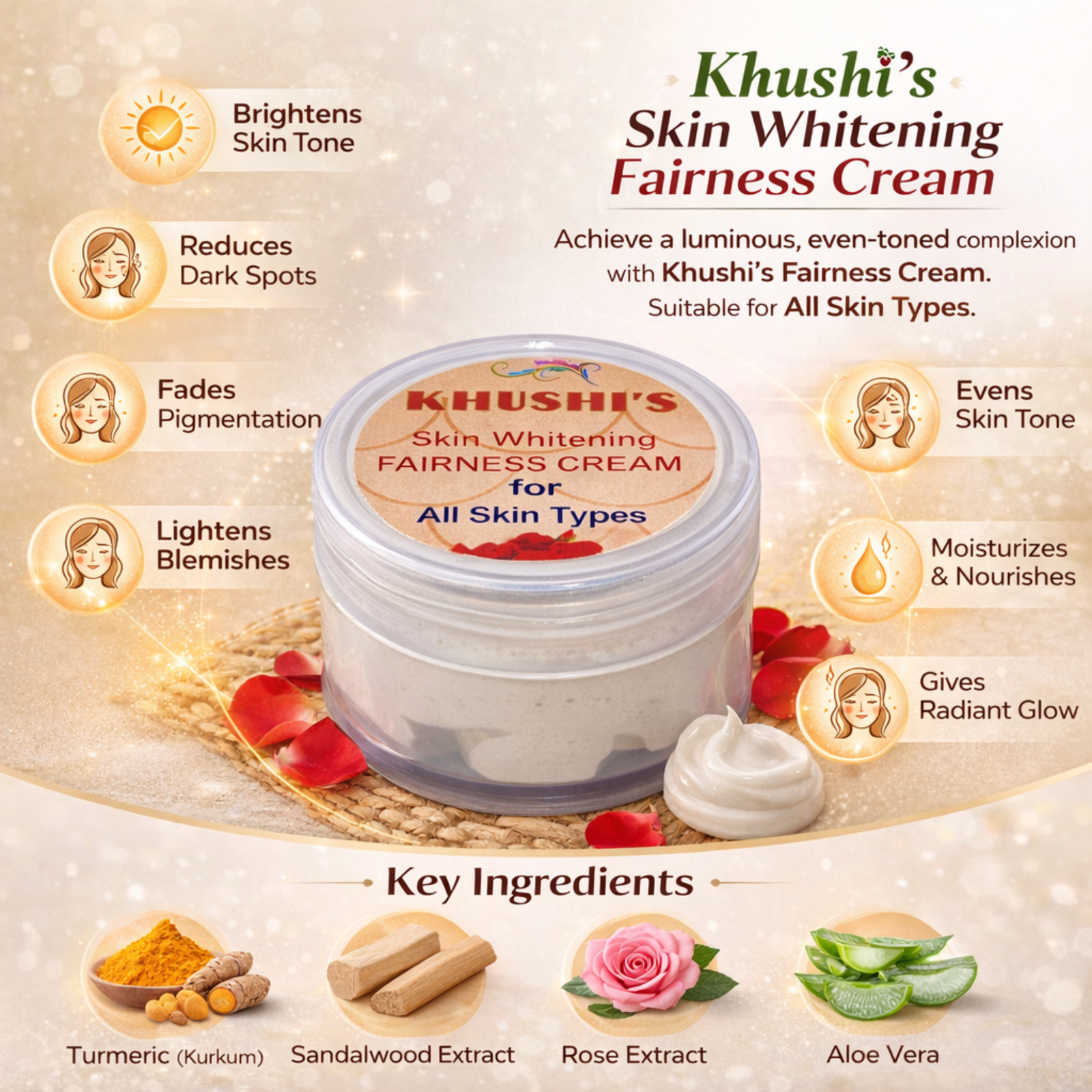 Khushi Skin Whitening Fairness Cream is a herbal face cream formulated for daily skincare. Designed for all skin types, it blends traditional ingredients such as turmeric, sandalwood, rose extract, and aloe vera to support a clean, fresh, and balanced complexion. Its lightweight texture absorbs easily, making it suitable for both day and night use. Ideal for routine skincare, this cream helps maintain an even-looking skin tone while keeping the skin soft and hydrated.