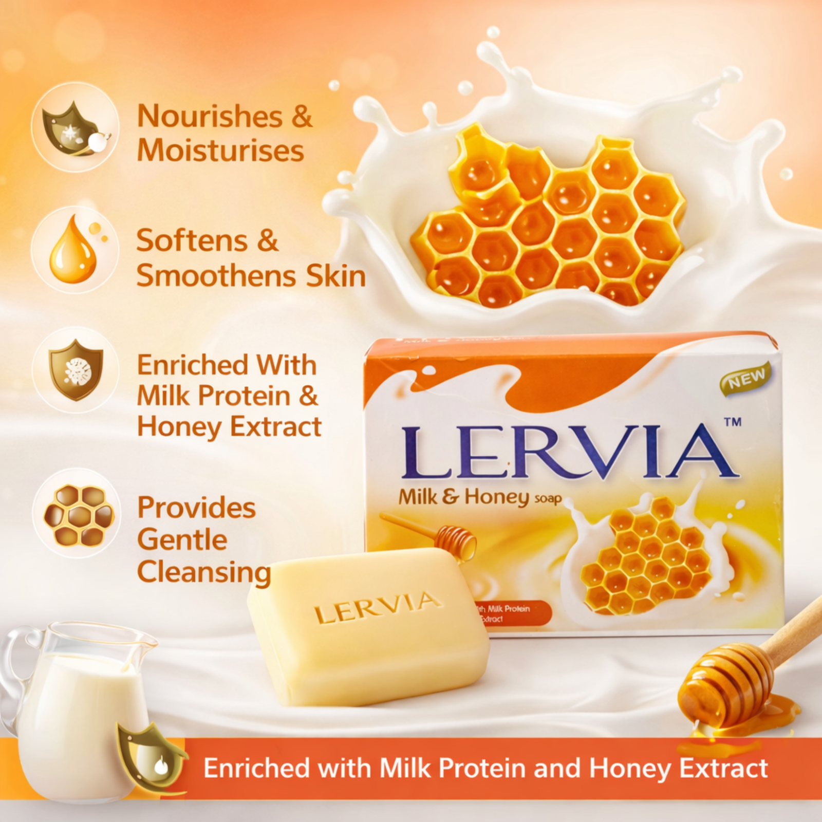 Lervia Milk & Honey Soap is crafted for everyday bathing with a gentle formulation enriched with milk protein and honey extract. The soap cleanses the skin while helping maintain its natural moisture balance. Its creamy lather and mild fragrance make it suitable for regular use by the whole family. Designed for daily hygiene, this bath soap leaves the skin feeling clean, soft, and refreshed after every wash.