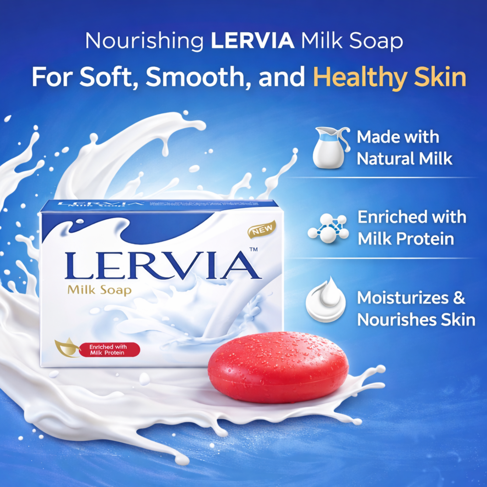 Lervia Milk Soap is formulated with milk protein to support everyday skin cleansing while helping maintain the skin’s natural moisture balance. Its gentle lather cleanses the skin without leaving it feeling dry, making it suitable for regular use by the whole family. The soap features a mild fragrance and a smooth texture that leaves skin feeling fresh and comfortable after every bath.