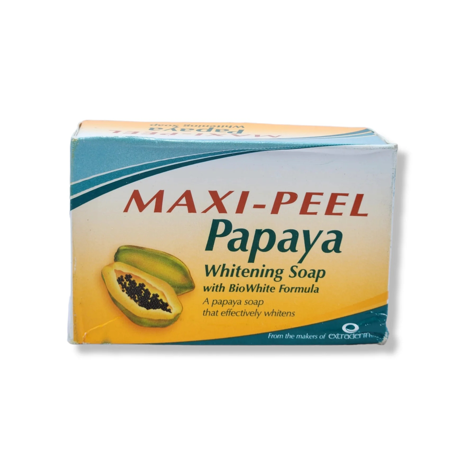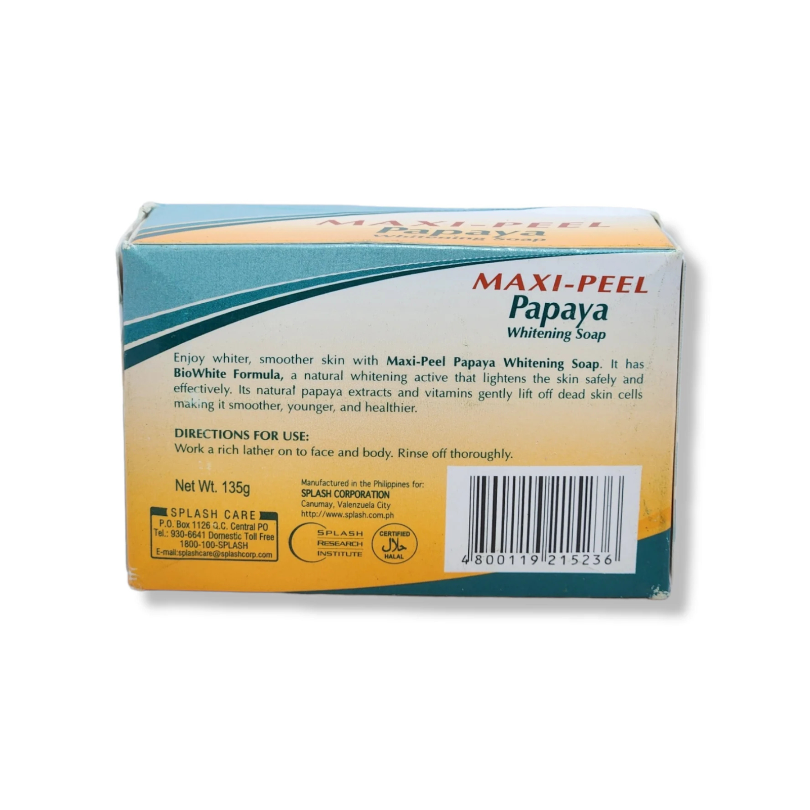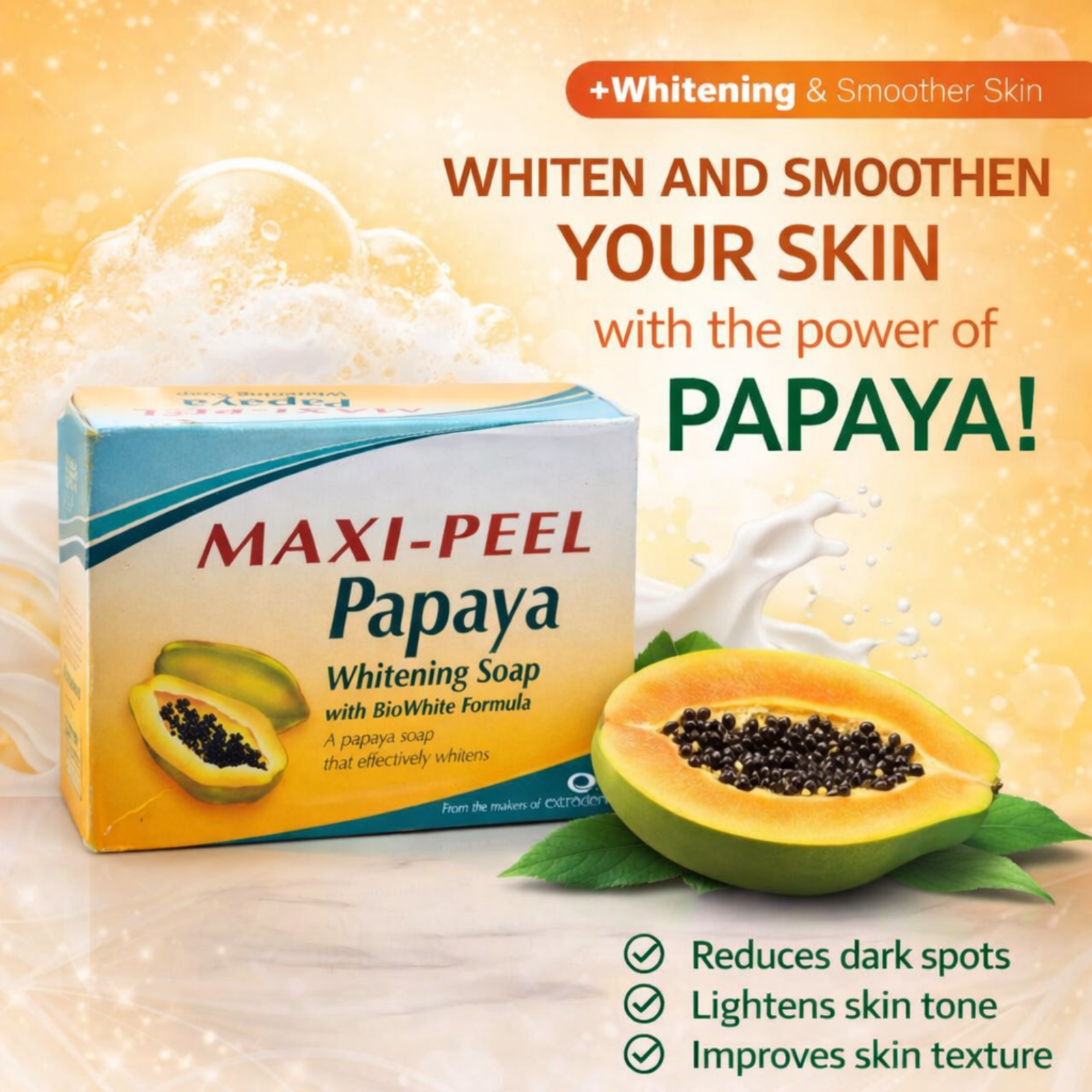 Maxi-Peel Papaya Whitening Soap with BioWhite Formula is a papaya extract–based cleansing bar designed for daily skin care. Enriched with papaya enzymes, this soap helps cleanse the skin while supporting a refreshed and smooth-looking appearance. Its BioWhite Formula complements regular bathing routines by targeting dullness and uneven skin tone caused by daily exposure to dirt and impurities. Suitable for normal to oily skin types, this soap is commonly used on the face and body as part of a consistent skincare regimen.