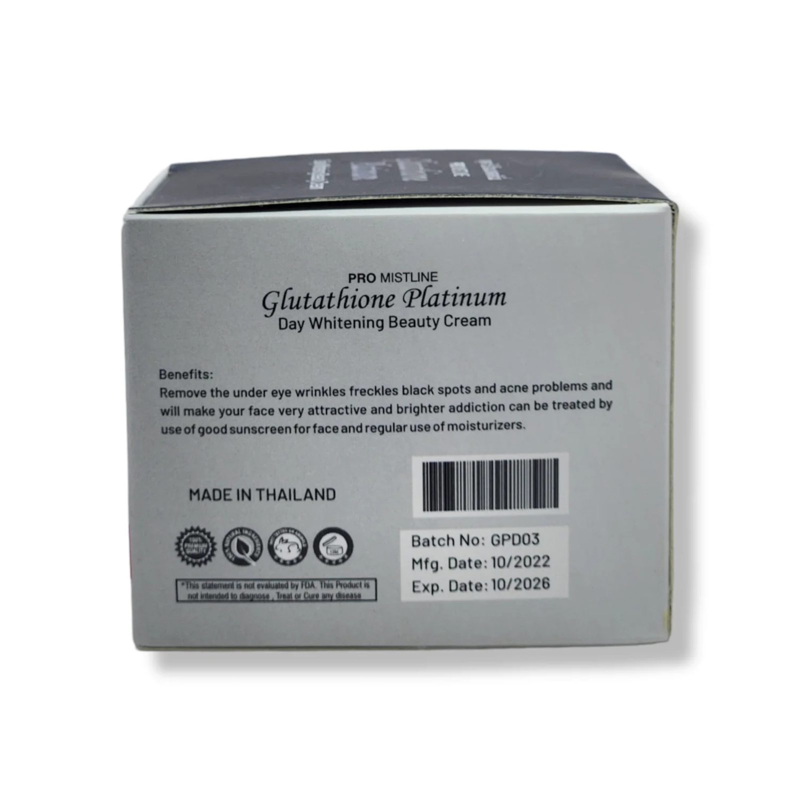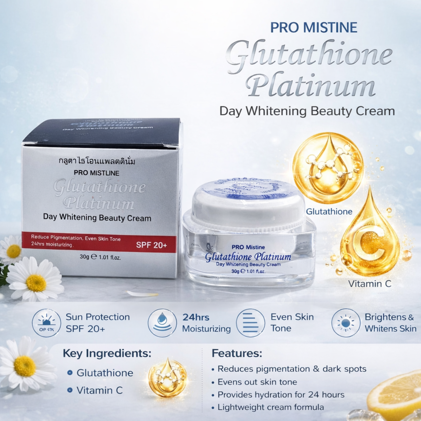Mistline Glutathione Platinum Day Whitening Cream is a lightweight daily-use face cream designed for daytime skincare. Enriched with Glutathione and formulated with SPF 20+, it helps protect skin from everyday sun exposure while maintaining hydration throughout the day. Its smooth texture absorbs easily, making it suitable for regular use under makeup or on bare skin. Ideal for normal to combination skin types, this cream supports an even-looking complexion and a fresh, well-groomed appearance.