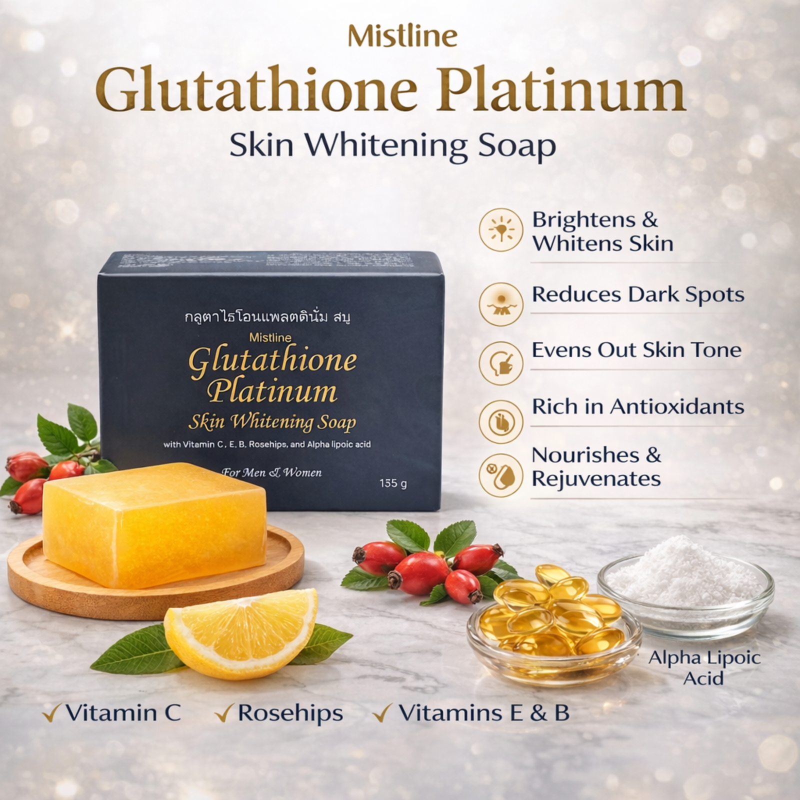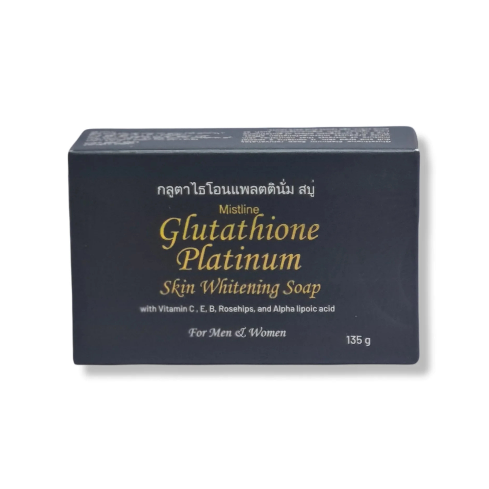 Mistline Glutathione Platinum Skin Whitening Soap is a premium bathing bar formulated with a blend of Glutathione, Vitamin C, Vitamin E, Vitamin B, Rosehips, and Alpha Lipoic Acid. Designed for daily cleansing, this soap helps remove impurities while supporting a fresh, even-looking complexion. Its gentle formulation makes it suitable for both men and women and ideal for regular face and body use.