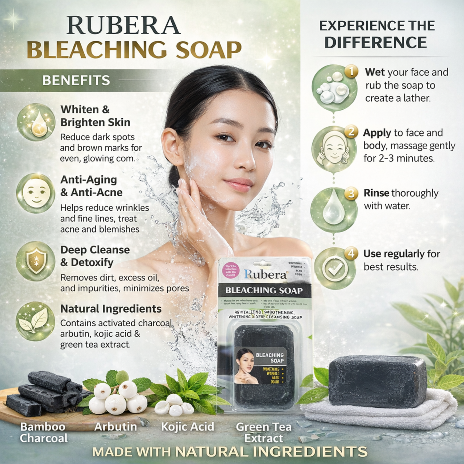 Rubera Bleaching & Deep Cleansing Soap is formulated to gently cleanse the skin while helping remove surface impurities, excess oil, and daily buildup. Designed for both face and body use, this soap supports a clean, refreshed skin feel with every wash. Its deep-cleansing action helps maintain smooth-looking skin and is suitable for regular skincare routines.