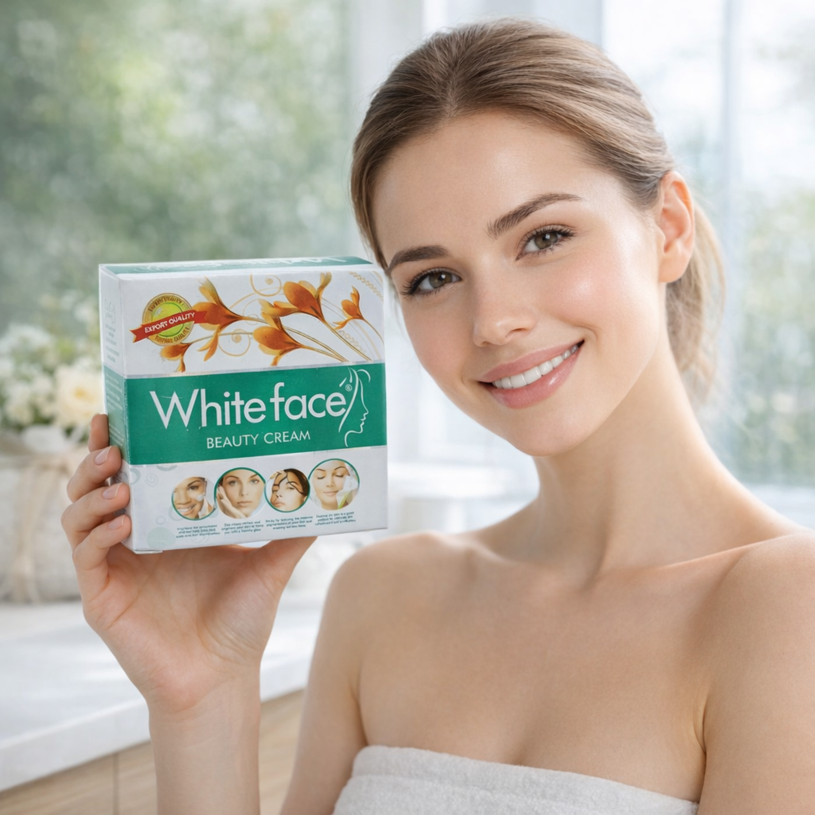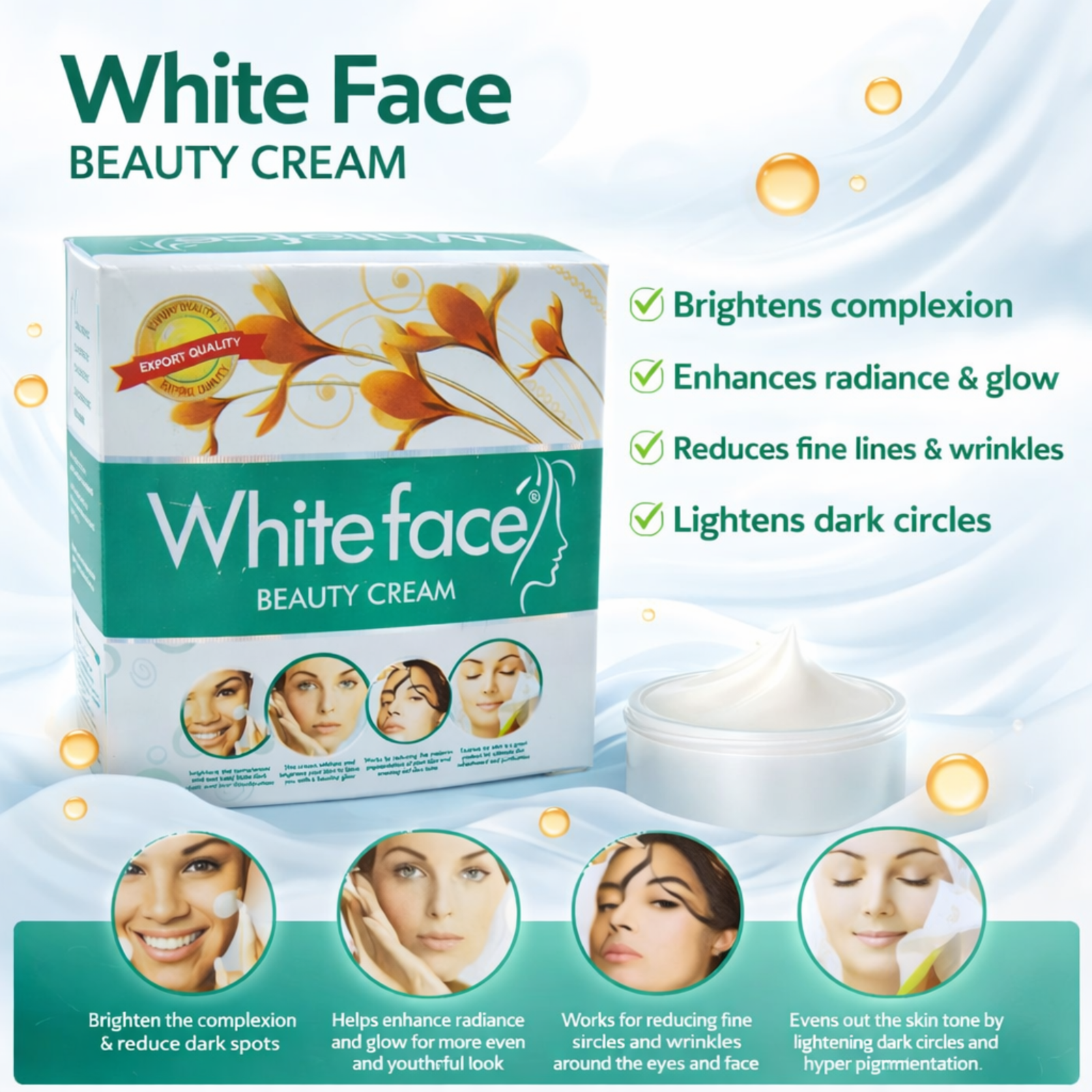 White Face Beauty Cream 20g is an export-quality face care cream designed for daily skincare routines. Its lightweight texture absorbs easily, making it suitable for regular use on all skin types. The formulation supports a clean, fresh look and helps maintain an even appearance of the skin. Ideal for both men and women, this compact 20g pack is convenient for home use and travel.