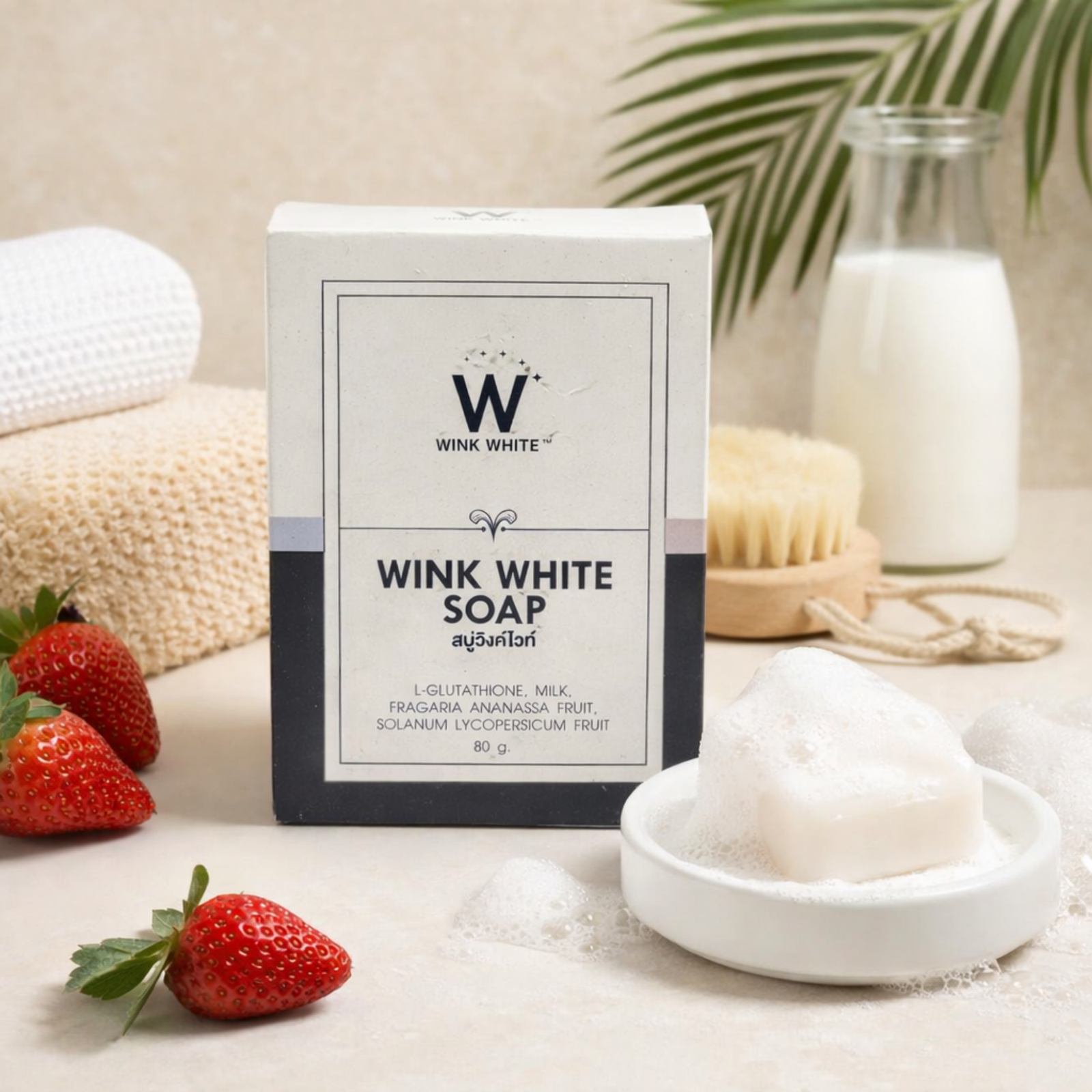 Wink White Soap 80g is a gentle daily cleansing bar formulated with L-Glutathione, Milk, Strawberry Extract, and Tomato Extract. This thoughtfully blended formula helps cleanse the skin while maintaining its natural moisture balance. Enriched with fruit-based antioxidants and nourishing milk proteins, the soap is suitable for everyday use on face and body.