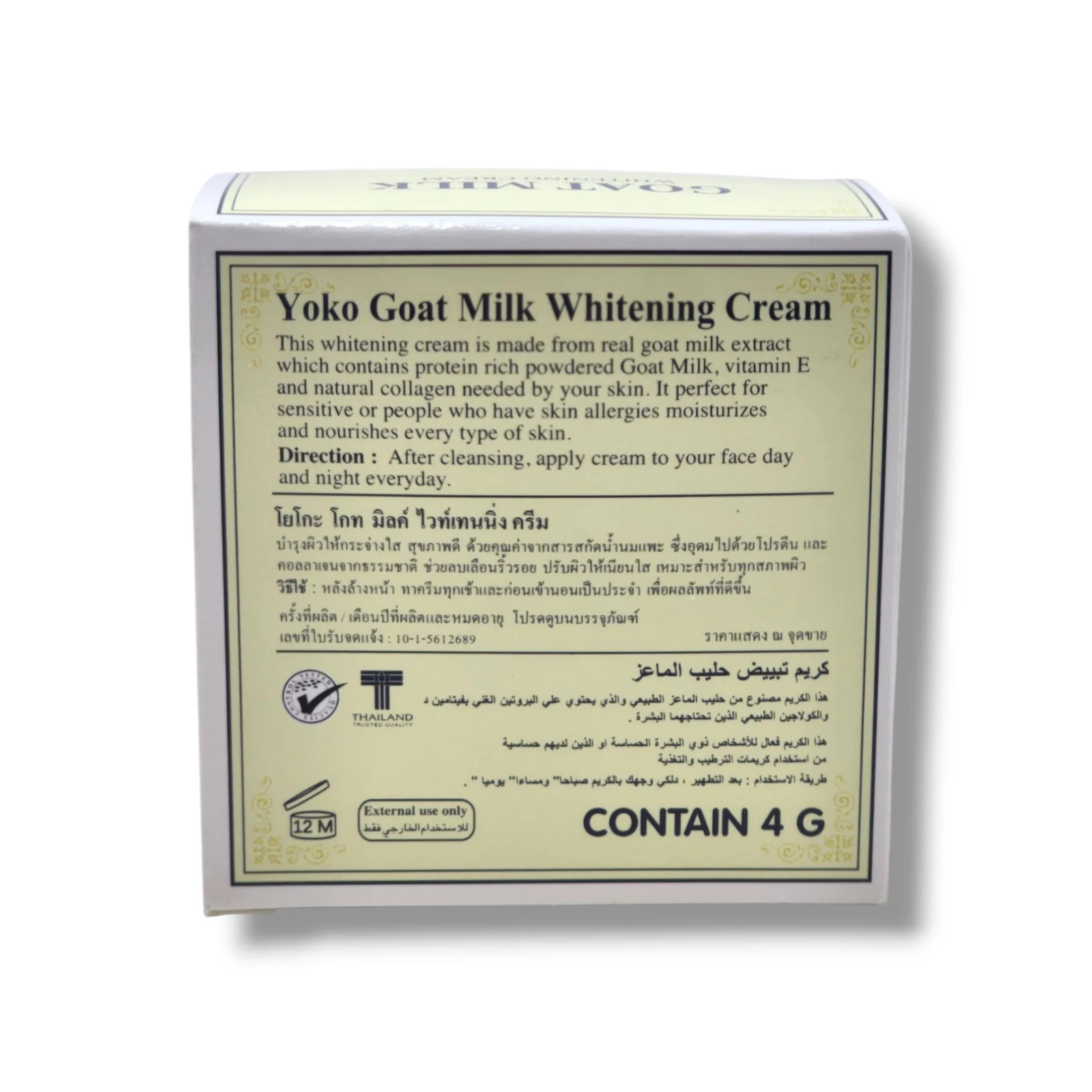 Yoko Goat Milk Skin Cream 4g is a compact daily-use cream formulated with goat milk extract and Vitamin E. It helps maintain skin hydration while supporting a smoother, more even-looking complexion. The lightweight texture absorbs quickly, making it suitable for regular use on the face and body. Ideal for travel and on-the-go skincare, this cream is designed for all skin types and everyday routines.