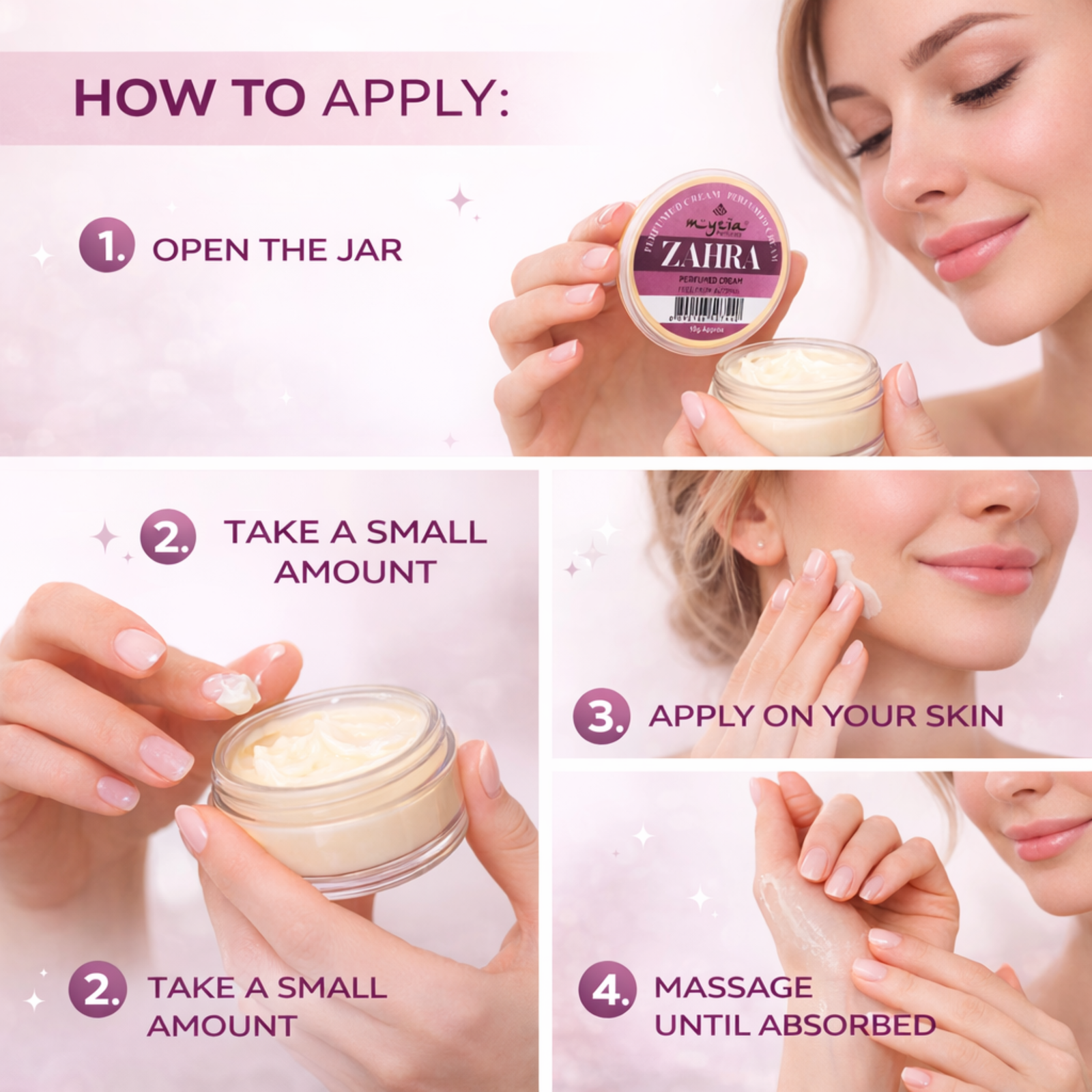 Myzia Zahra Perfume Cream is a modern solid perfume crafted for those who prefer subtle, skin-close fragrance. Unlike spray perfumes, this cream perfume blends smoothly into the skin, releasing its aroma gradually throughout the day.
